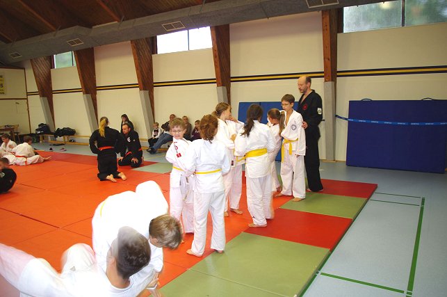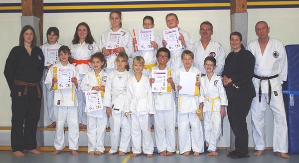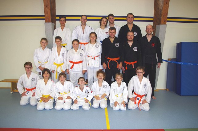 Unter den Augen von Vereinstrainer Josef Flecken und Dieter Wilsberg aus Erftstadt, beide 2. Dan und lizenzierte Prüfer beim Deutschen Jiu Jitsu Bund (DJJB) und Korporation Internationaler Danträger (KID), legten elf Kinder ihre Gürtelprüfung ab. Als Beisitzer fungierten einmal mehr die Trainerinnen Elena Mies und Nadine Benzmüller (beide Braungurtträgerinnen).