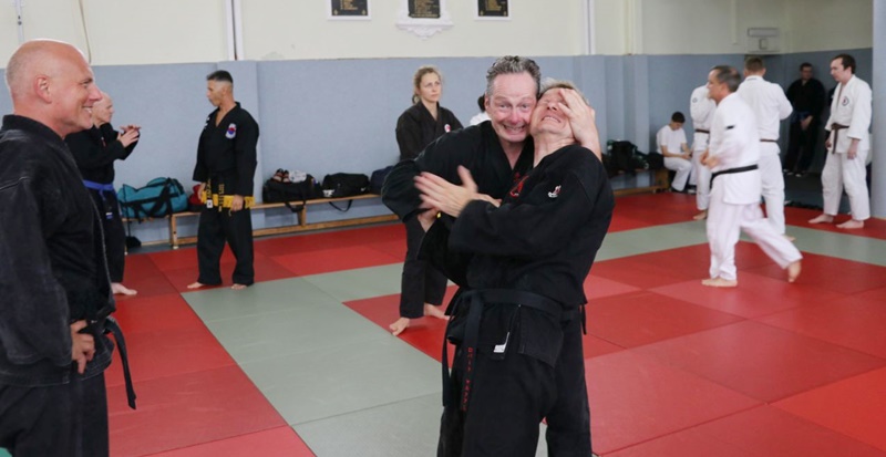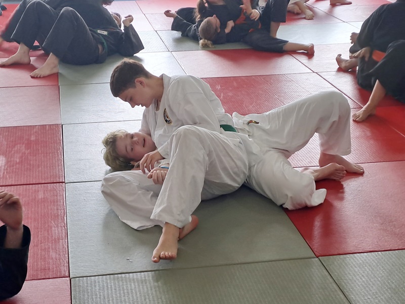 Marijo (2. Dan Jiu Jitsu) aktiv. Die Kämpfenden fassen sich