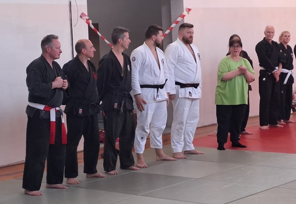 Trainiert wurde in zwei Gruppen. Dabei übernahm Michele, „Mister Knife“, in erster Linie die Messerabwehren. Es ist immer wieder erstaunlich, welches Gespür der Referent für diese Waffe aufbringt und dies entsprechend auf die Teilnehmenden überträgt. Markus, der offensichtlich über ein unbegrenztes Repertoire an Abwehrtechniken verfügt, übernahm die Distanz- und Körperangriffe. Die Techniken trug er so realistisch vor, dass alle Sportler/innen nicht unbedingt mit seinem Uke, Rene, tauschen wollten. Dirk nahm sich vor, die Budokas für den Langstock zu sensibilisieren. Für viele war das Neuland. Wie und wo wird der Stock gegriffen? Wie hole ich Schwung und wie ist meine Körperhaltung dabei? Dirk erklärte die Sequenzen zwischen Angriff und Verteidigung, die sich ganz nach dem Prinzip von Yin und Yang nicht bekämpfen, sondern ergänzen. André musste seine Teilnahme leider kurzfristig wegen Krankheit absagen. Für Sabines Söhne, Alexander und Christoph (jeweils 1. Dan Jiu-Jitsu), stellte dies kein Problem dar. Kurzerhand übernahmen sie die große Gruppe und führte sie behutsam an den Bodenkampf heran. Über Erfahrung verfügen sie genug. Haben die Zwei doch oft genug in dieser Disziplin an Meisterschaften teilgenommen.
