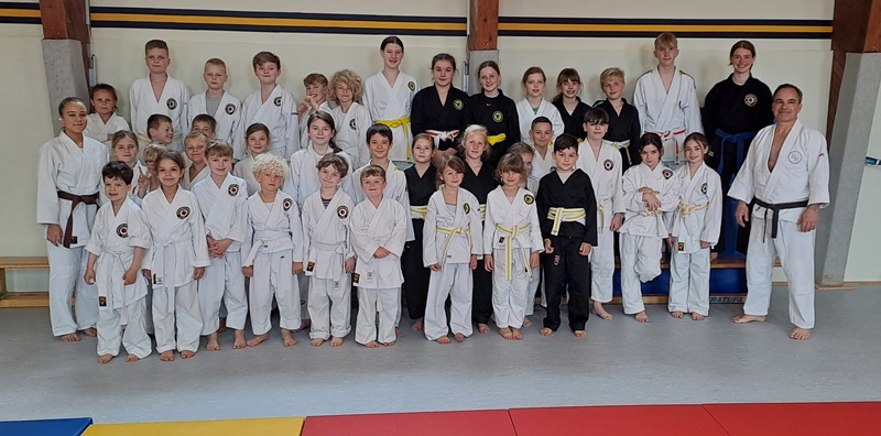 Als Lehrgangsthema hatte der Referent „Distanzangriffe“ gewählt. Bei dieser Art von Angriffen besteht, wie der Name schon sagt, ein räumlicher Abstand zwischen Angreifer und Verteidiger. Im Gegensatz zu den Körperangriffen besteht hier also die Möglichkeit, wenn auch nur für sehr kurze Zeit, auszuweichen und den eigenen Körper durch eine entsprechende Abwehrhaltung zu schützen. Mit etlichen neuen Aufwärmspielen brachte André die Teilnehmenden auf Betriebstemperatur, bevor er einige Jiu-Jitsu Techniken demonstrierte. Auf der Tatami fand ein reges Treiben statt. Es bereitete allen großen Spaß, der immer an erster Stelle steht. Auch bei den anwesenden Zuschauern sah man nur strahlende Gesichter. So verging die Zeit mal wieder viel zu schnell. Man hatte den Eindruck, dass die jungen SportlerInnen gerne noch stundenlang weiter trainiert hätten. Ein weiterer Lehrgang in diesem Jahr mit dem beliebten Jugendwart und seinem Team ist bereits im Gespräch.