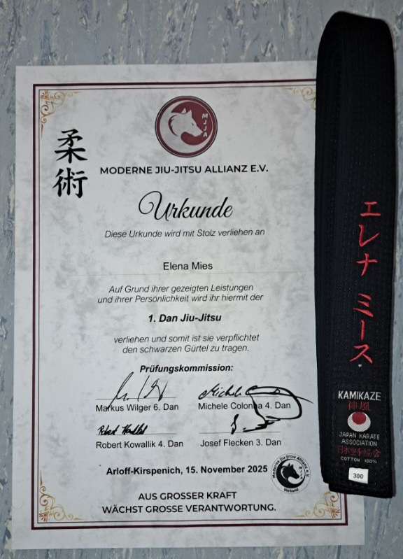 Eine Schwarzgurtträgerin im Jiu-Jitsu im Kreis Euskirchen zu sein, ist wirklich etwas Besonderes – und das aus mehreren Gründen. Der Weg zum Schwarzgurt ist lang, anspruchsvoll und erfordert jahrelanges Training, Durchhaltevermögen und Leidenschaft für den Sport. In unserer Region ist die Jiu-Jitsu-Gemeinschaft vergleichsweise klein, und nur sehr wenige erreichen dieses hohe Niveau. Der Schwarzgurt steht nicht nur für technisches Können, sondern auch für die persönliche Entwicklung, Disziplin und die Bereitschaft, Wissen weiterzugeben. Eine Schwarzgurtträgerin ist damit ein wichtiges Vorbild, insbesondere für junge Menschen und Frauen, die vielleicht selbst den Weg auf die Tatami finden möchten. Umso erfreulicher ist es, dass Elena nun diese Meisterstufe erreicht hat. Ihre Begeisterung für diesen Sport hat sie mit viel Einsatz und Herzblut gezeigt.