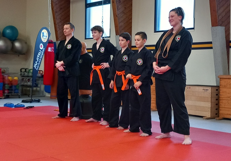 Finn, Jakob und Phil aus der Schülergruppe zeigten nach den Ehrungen der beiden neuen Sensei eine großartige Vorführung. Alle waren begeistert von der beeindruckenden Kampfkunst, die die Orangegurte auf der Tatami zeigten. Die Prüfer, ihre Trainer/in und die Zuschauer freuten sich sehr über das Können, das die drei präsentierten.
