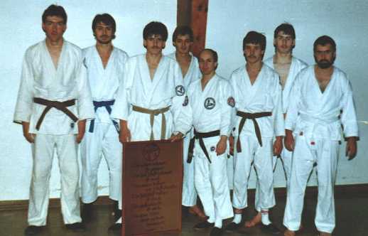 Es zeigt die Gruppe zusammen mit Hans Gert Niederstein (verstorben 1985), dem Gründer und ersten Präsidenten des Deutschen Jiu-Jitsu Bundes (li.)